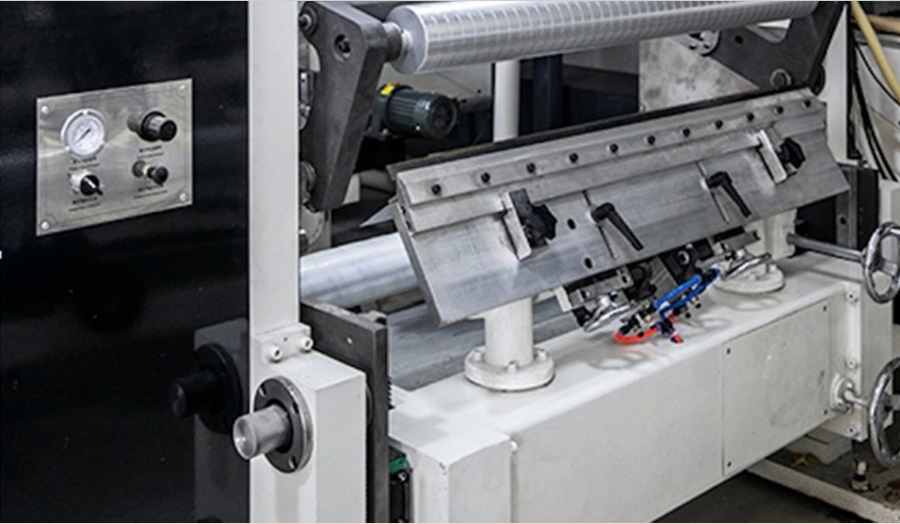 切槽分切是材料運行在刀槽輥時,將切刀落在刀槽輥的槽中,將材料縱向切開,此時材料在刀槽輥有一定包角,不易發生漂移現象。再分切流延PP膜或邊料較窄的膜時,常用這種分切方式,可以提高分切效率。但是對于懸空分切,它的缺點是對刀比較不便。